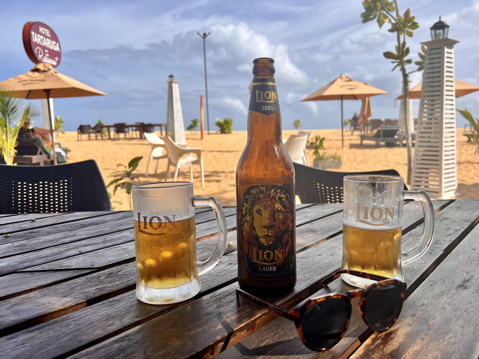 Nos instalamos y aprovechamos para descubrir un poco la zona e ir a la playa. Hemos quedado con Sure alrededor de las 4.30 pm, así que tenemos un poco de margen. El hotel está al lado de la Playa, nos apetece encontrar un chiringuito donde poder sentarnos y tomar algo, hace un calor húmedo bastante intenso. Finalmente lo encontramos y nos tomamos una Lion lager bien fresquita.